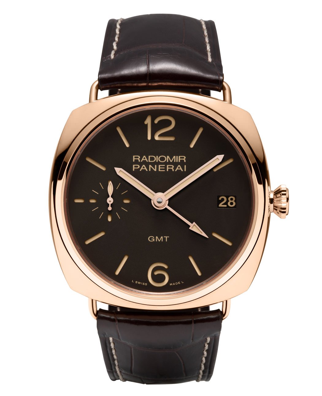 Dial: Brown with luminous Arabic numerals and hour markers. Date at 3 o’clock, seconds at 9 o’clock.