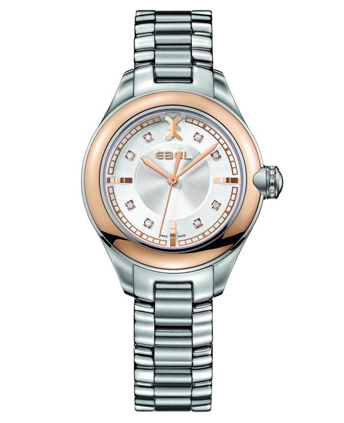 The new Onde collection by Ebel is available in two case sizes, 30mm and 36mm, and with a choice of cases in stainless steel or 18-carat red gold. The model shown is the 30mm version in stainless steel with an 18-carat red gold bezel. Its classic look is achieved by a combination of polished and brushed surfaces (including on the link bracelet) and a simple dial adorned with the Ebel symbol at 12 o’clock, hour markers at 3, 6 and 9 o’clock and eight diamonds in the remaining hour positions.