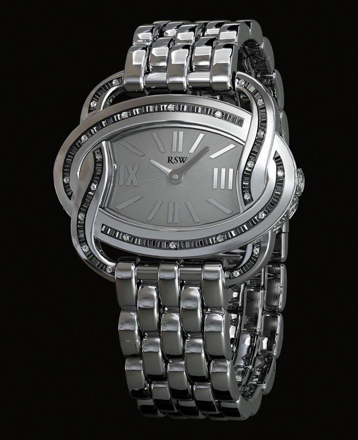 The windflower is the inspiration for this unusual case design by RSW, which has a steel case and is available with 24, 30 or 76 diamonds set on the 36mm by 23.35mm case. An ETA 901.001 quartz movement drives the hour and minute hands, which indicate the time against an elegant dial (in black, grey, white or brown) whose symmetry is broken only by the Roman numerals at 3 o’clock and 9 o’clock. Matching satin straps or multi-link stainless-steel bracelets are available.