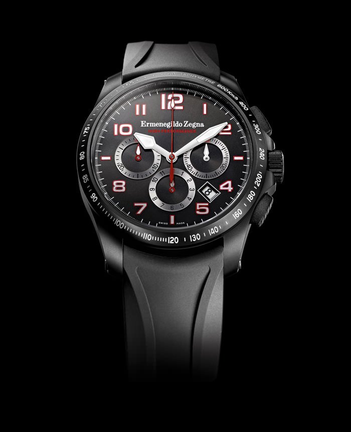 The High Performance Chronograph is the first application in timepieces of Zegna’s philosophy, which revolutionised the business suit from 1985. The High Performance Chronograph has a 42mm black ceramic case with black rubber-coated crown and pushers and a black rubber strap. The collection is made in Switzerland by the Sowind Group, the owners of Girard-Perregaux, using ETA movements. The High Performance Chronograph uses the self-winding ETA 2894 movement operating at 28,800 vibrations per hour and with a power reserve of 42 hours. A High Performance Sea Diver model is also available, using the ETA 2824 self-winding movement.