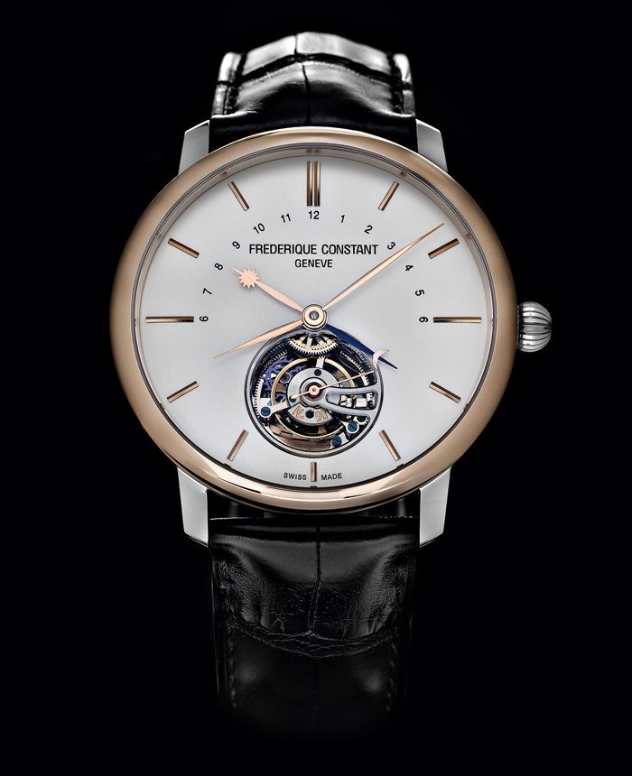 Independent manufacture Frederique Constant introduces an affordable tourbillon with a silicium escape wheel and lever in its FC-980-3 in-house movement that beats at 28,800 vibrations per hour and offers a power reserve of 48 hours. This model comes with a 43mm case in polished stainless steel with a bezel in polished stainless steel or 18-carat red gold, each version individually numbered and limited to 188 pieces. It is fitted with a black alligator leather strap with folding clasp and is presented in a luxurious wooden gift box.