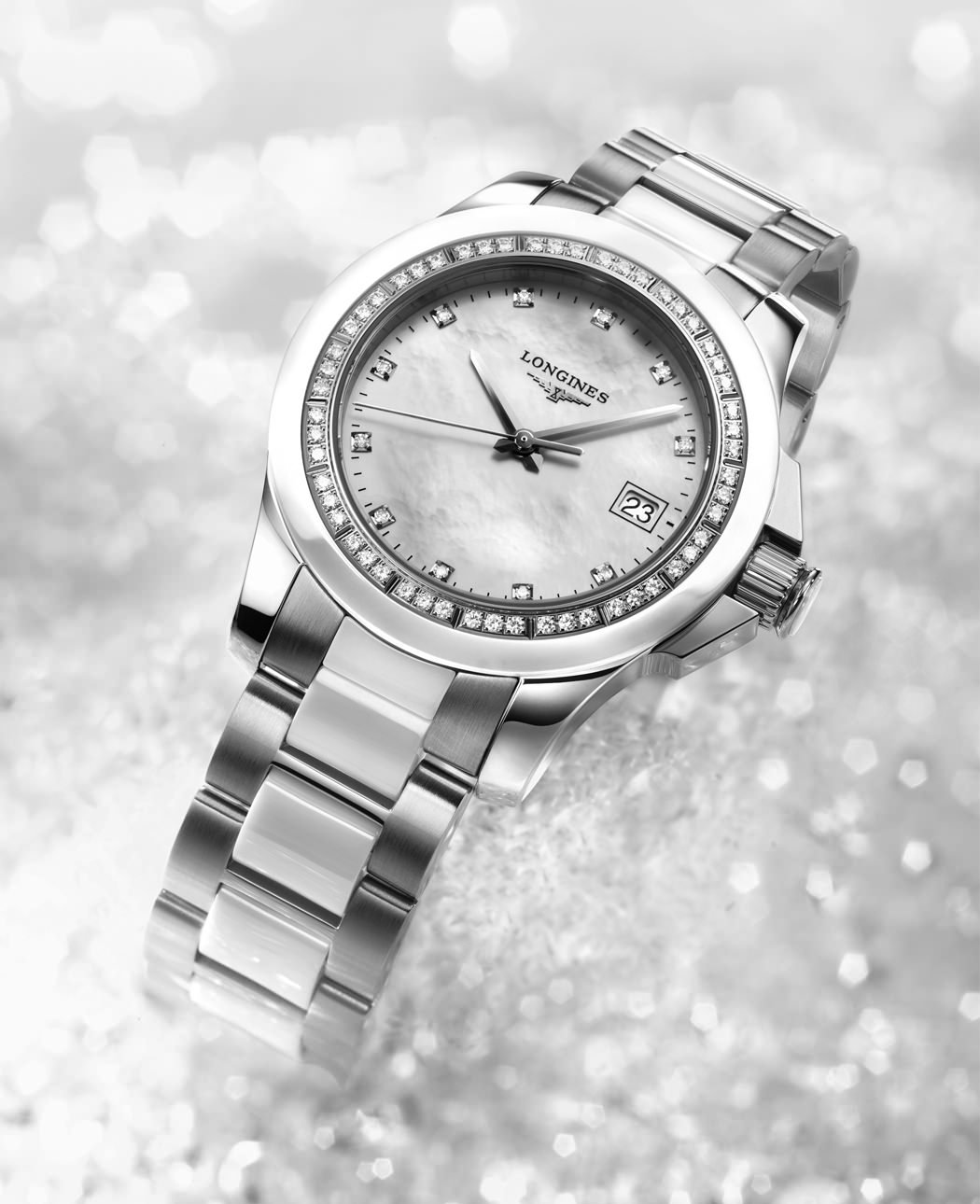 Case: Round, Æ 35 mm, stainless steel with steel bezel set with 54 Top Wesselton VVS diamonds (0.367 carats) and black or white ceramic sections. Screw-down case back and lateral protection for the crown. Scratch-resistant sapphire crystal with anti-reflective coating on the underside.