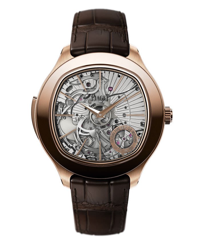 It has taken the company three years of development work to design and produce the 4.8mm thick Calibre 1290P with its 407 individual components, which helps to make this new model the world’s thinnest minute-repeater wristwatch. It has a 48mm case in 18-carat pink gold that comprises 69 individual elements and, in the absence of a dial, 60 rays engraved on the movement serve as the minute markers. The striking mechanism chimes the time at a volume of 64 decibels—just one decibel less than the level of an average conversation.