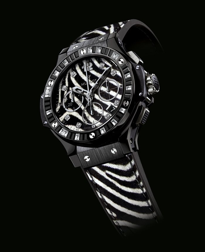 With this new model, Hublot continues the animal-print theme that it started with its Leopard Bang and Boa Bang models. The 41mm case is in black ceramic with a distinctive zebra print dial and strap, with diamonds, colourless topaz and black spinels completing the monochrome look of the watch, powered by the HUB4300 self-winding chronograph movement, which offers a power reserve of 42 hours. This is a limited edition of 250 pieces but with two other models (also limited to 250 pieces each) available in red gold or white ceramic.