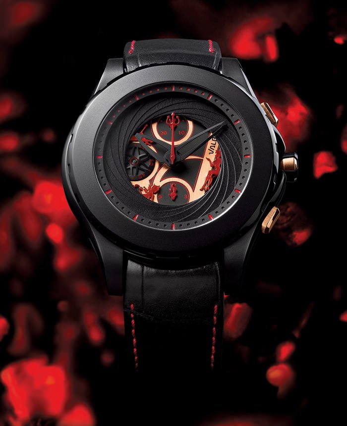 Only six models of this “diabolical” chronograph will be made, with a case in grade five titanium with a red-gold DLC coating. The diaphragm system hidden beneath the dial allows the wearer to choose between a sombre black dial on which only the black hands and the distinctive red seconds hand in the form of the devil’s trident can be seen and the fully open display with the chronograph counters. This model is powered by a self-winding chronograph movement that offers 44 hours of power reserve.