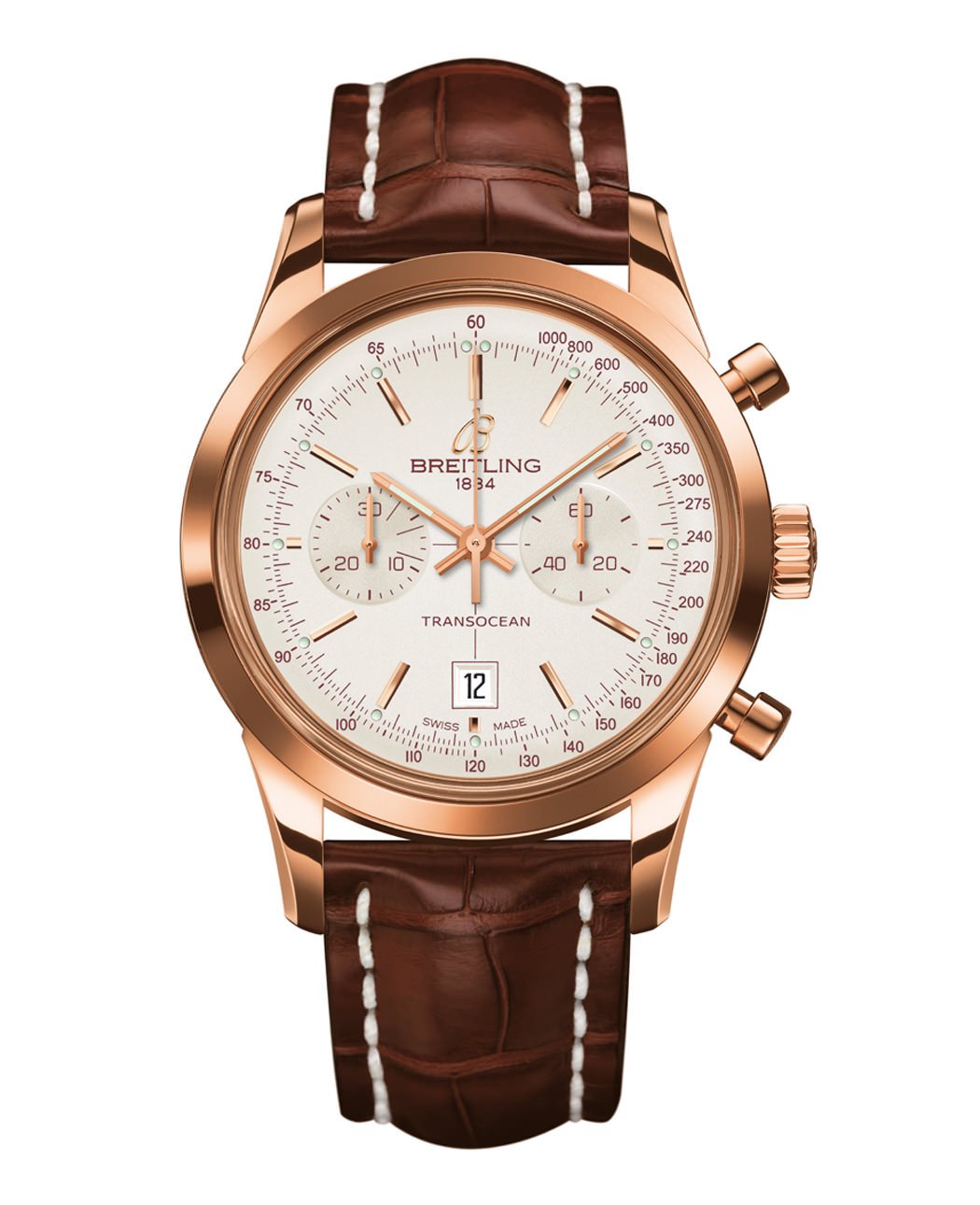 Movement: Breitling Caliber 41, officially chronometer-certified by the COSC, selfwinding, high-frequency (28,800 vibrations per hour), 38 jewels, 1/4th second chronograph, 30-minute totalizer. Calendar.