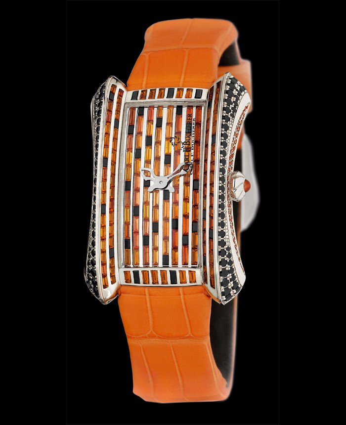 The Lucerne-based brand uses bamboo not as a material but as an inspiration for the design of this new limited edition of 25 pieces. The 18-carat white-gold case and dial are both set with orange and black baguette-cut sapphires (for a total of 173 stones) plus a further 239 round black and orange sapphires on the outer facets of the case. A quartz movement displaying the hours and minutes powers this timepiece, which is completed by an orange alligator leather strap with a white-gold pin buckle.