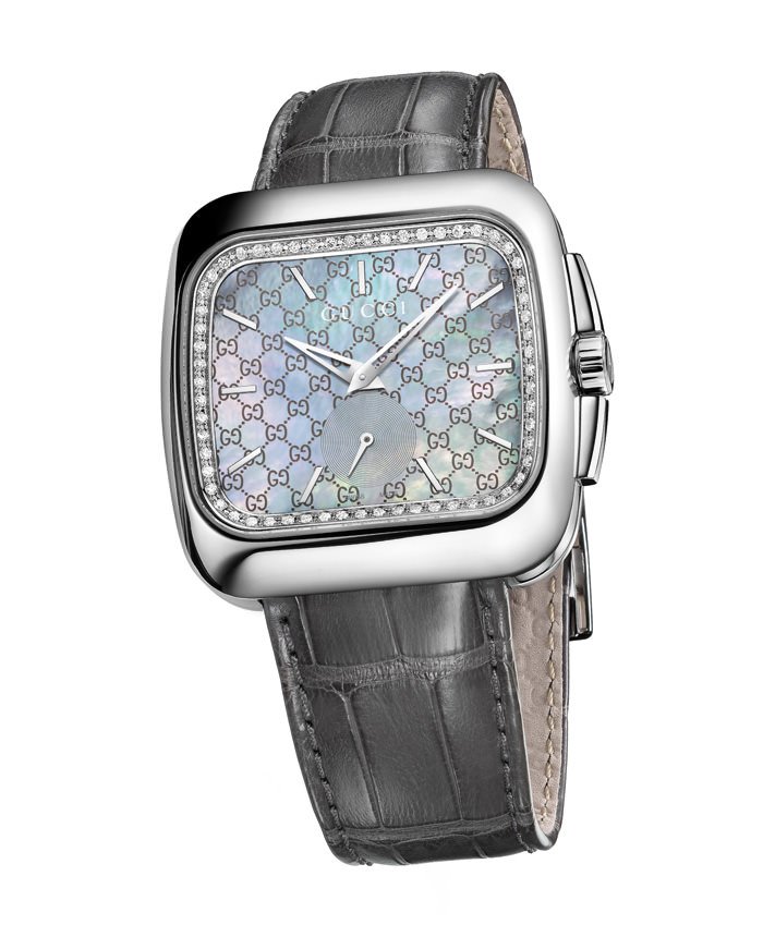 This new model is a ladies’ version of the brand’s famous Coupé timepiece for men and is set with 60 diamonds (approx. 0.42 carats) on the flange of the dial. With a vintage look defined by the model’s rounded square case, the Gucci identity is reaffirmed by the Gucci logo and the “GG” pattern on the grey mother-of-pearl dial, whose only other adornment is the hour markers and three hands. The “GG” pattern also appears on the inner lining of the matching grey crocodile leather strap. A Swiss Made Ronda movement ensures the timekeeping.