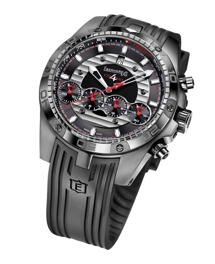 The all-black look in this new limited-edition model is achieved with a DLC treatment. But before this is applied, the steel case is treated to a low-temperature carbon diffusion that hardens the 46mm case. The four familiar in-line counters of Eberhard’s registered design are set against a back dial with a metal ring decorated with a Côtes de Genève finish and a black rubber strap completes the ensemble. The ETA 2894 self-winding chronograph is used as the base movement.