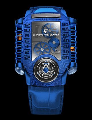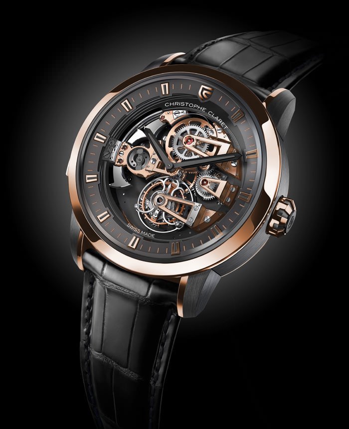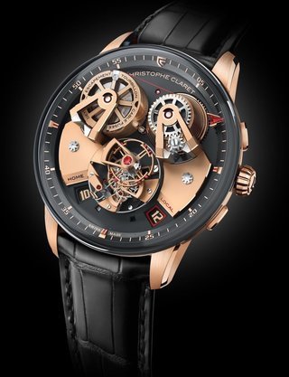 Claret’s contemporary interpretation of a minute repeater combines a modern design, open dial, and sapphire components with the tradition of Westminster Quarters striking on patented cathedral gongs, a 60-second tourbillon and distinctive Charles X style bridges. Great attention has been paid to perfecting the minute-repeater sound and Christophe Claret has even developed its own computer programme that analyses the sounds for pitch, duration and loudness. A grade 5 titanium case is used for the best possible sound reproduction.
