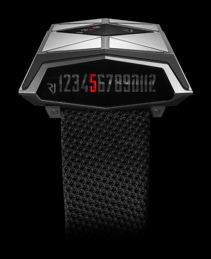 The futuristic design from the 1970s found on this new piece—a collaboration between Romain Jerome, Eric Giroud and Jean-March Wiederrecht—is not dissimilar to another timepiece that recently featured in our pages. But the movement and time displays on this piece operate on two different planes and, while the readout for the hours is the ultimate in simplicity, the engine that powers them is highly complicated, involving lateral and linear movement, jumping hours and a retrograde display. The minutes are visible on a black disc, read off the top of the case.