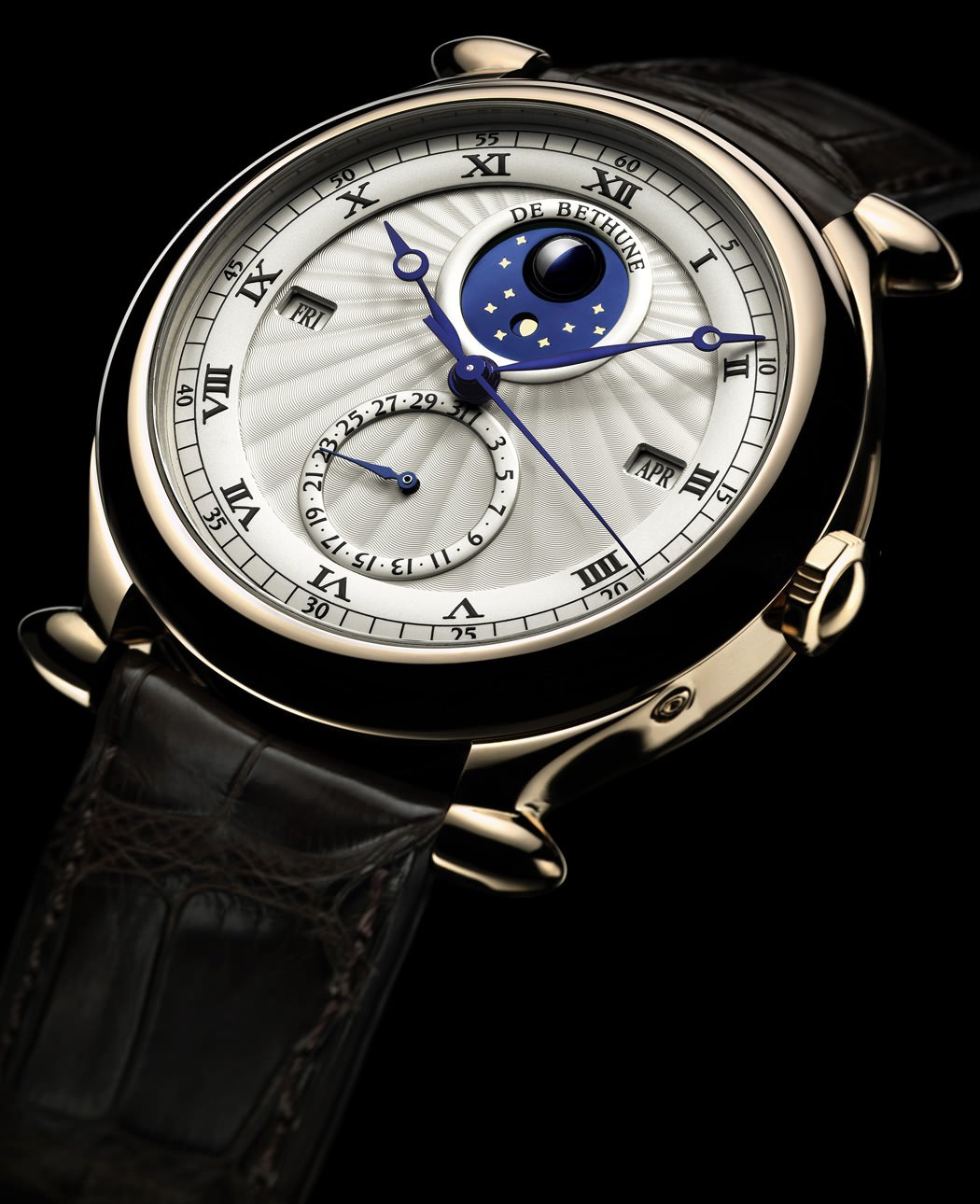 Dial: Silver-toned, sunburst guilloché motif, spherical moon phase indicator with De Bethune star-studded sky in flame-blued steel.