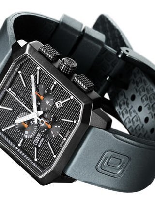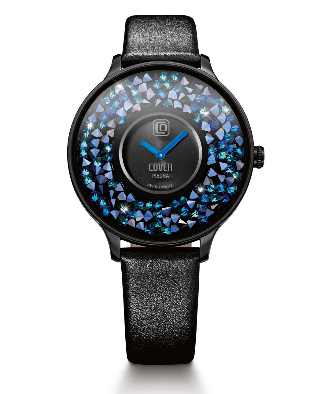 Surrounding a small central dial with stick hands on this 38mm model is a carpet of blue Swarovski crystals that glisten against a black background framed in a matt black PVD case with matching black alligator leather strap. An ETA quartz movement powers this eye-catching model, which is delivered in a Cover handbag.