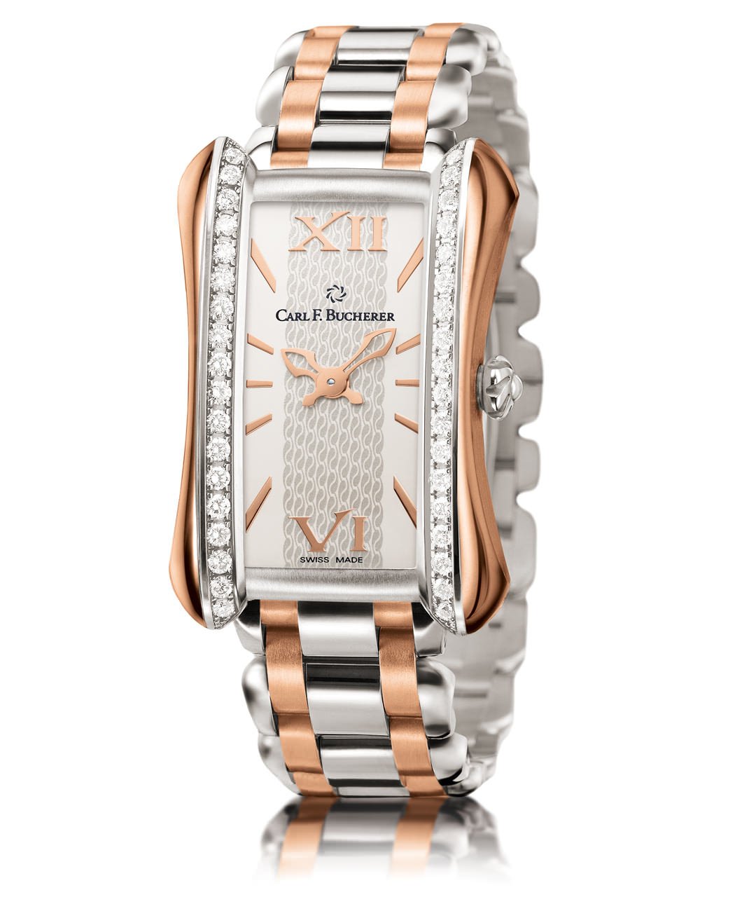 The latest model in the ladies’ Alacria collection combines 18-carat rose gold and stainless steel in the signature 38 x 26.5mm rectangular case, with its flared flanks and matching bracelet. The silvered dial is divided into vertical zones, with the central zone delimited top and bottom by bold Roman numerals. An added touch of luxury is provided by 38 brilliant-cut diamonds set along the vertical sides of the case. The Alacria TwoTone is powered by the CFB 1850 calibre quartz movement.