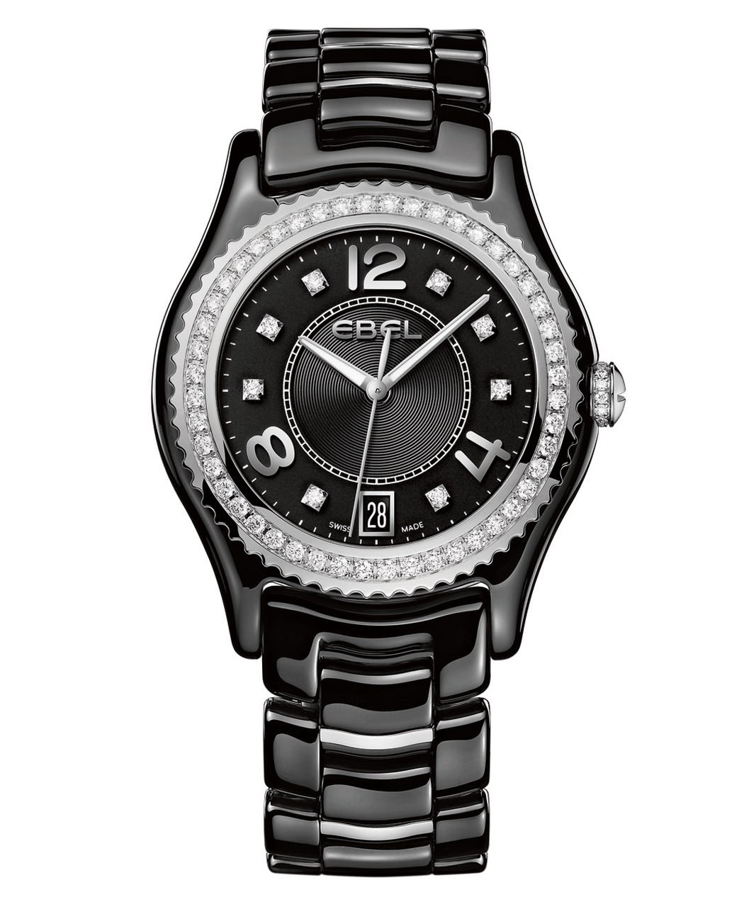 Deconstruct the name and you will quickly discover that this new version of the Ebel X-1 has a 34mm case. Composed of stainless-steel and black ceramic, with a grooved bezel set with 48 diamonds surrounding a black galvanic dial with three oversized Arabic numerals and a further eight diamonds, this piece ticks away the seconds using an ETA 955.412 quartz movement that also displays the date at 6 o’clock.