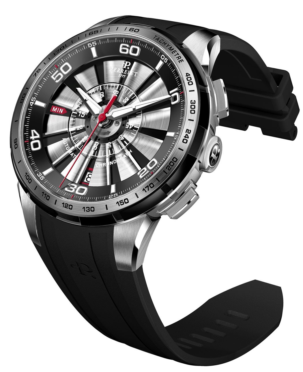 For BaselWorld 2013 Perrelet presented the first chronograph version in its Turbine collection. The distinctive double rotor that gives the watch its name, visible through apertures in the dial, are undisturbed by the addition of the chronograph complication thanks to an innovative 60-minute counter located on a central sapphire disc. The 47mm model is available in stainless steel or pink gold with DLC accents on the bezel ring and is powered by the P-361 chronograph calibre.