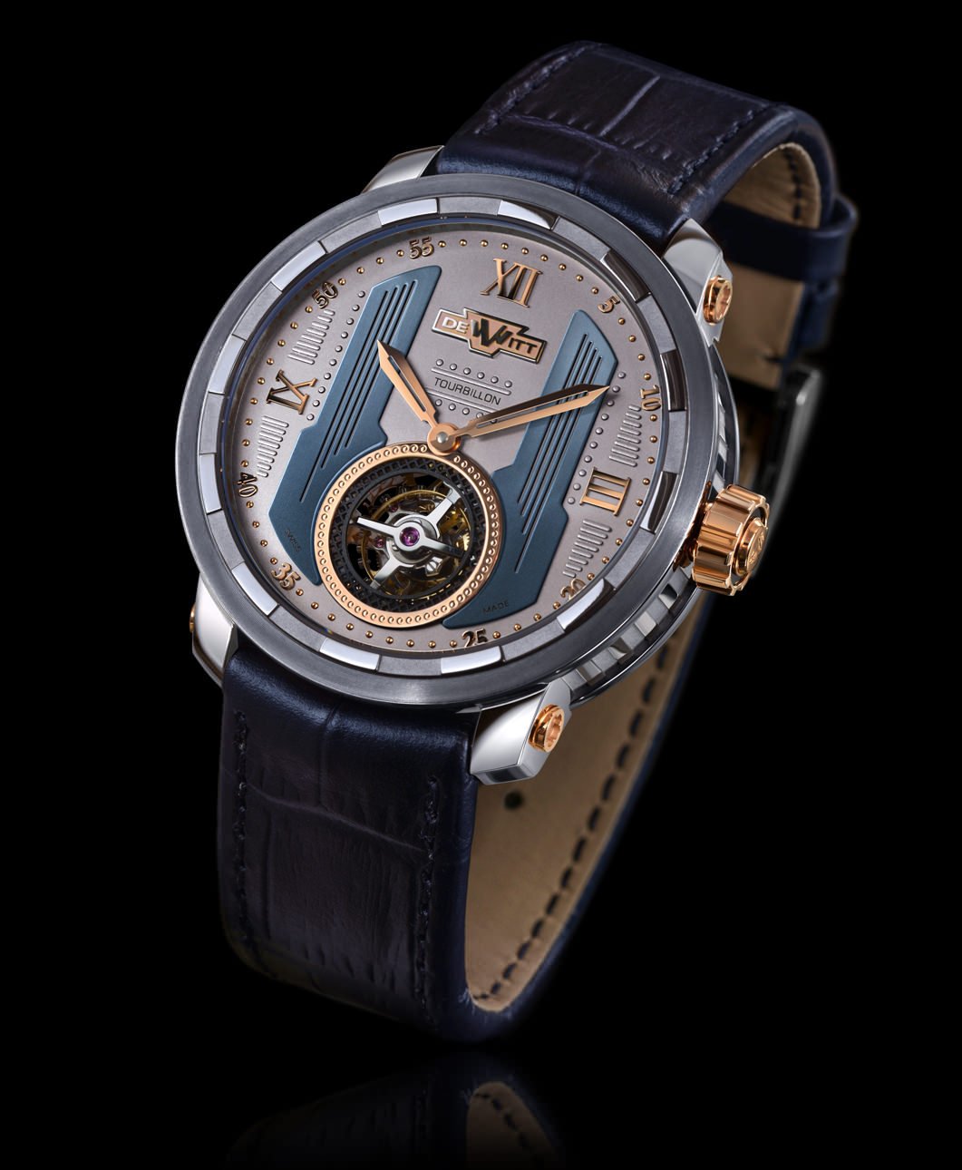 Movement: DW8028 manually-wound mechanical calibre integrating a tourbillon manufactured by DeWitt, 18,000 vibrations per hour, 72 hours power reserve, variable-inertia balance, balance spring with Breguet terminal curve