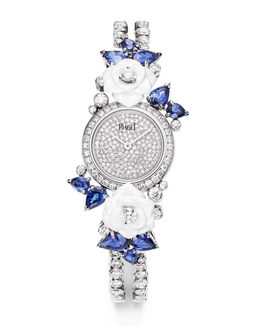 Case in 18K white gold set with 48 brilliant-cut diamonds (approx. 1.2 cts), 10 blue sapphires (approx. 5.5 cts) and white chalcedony.