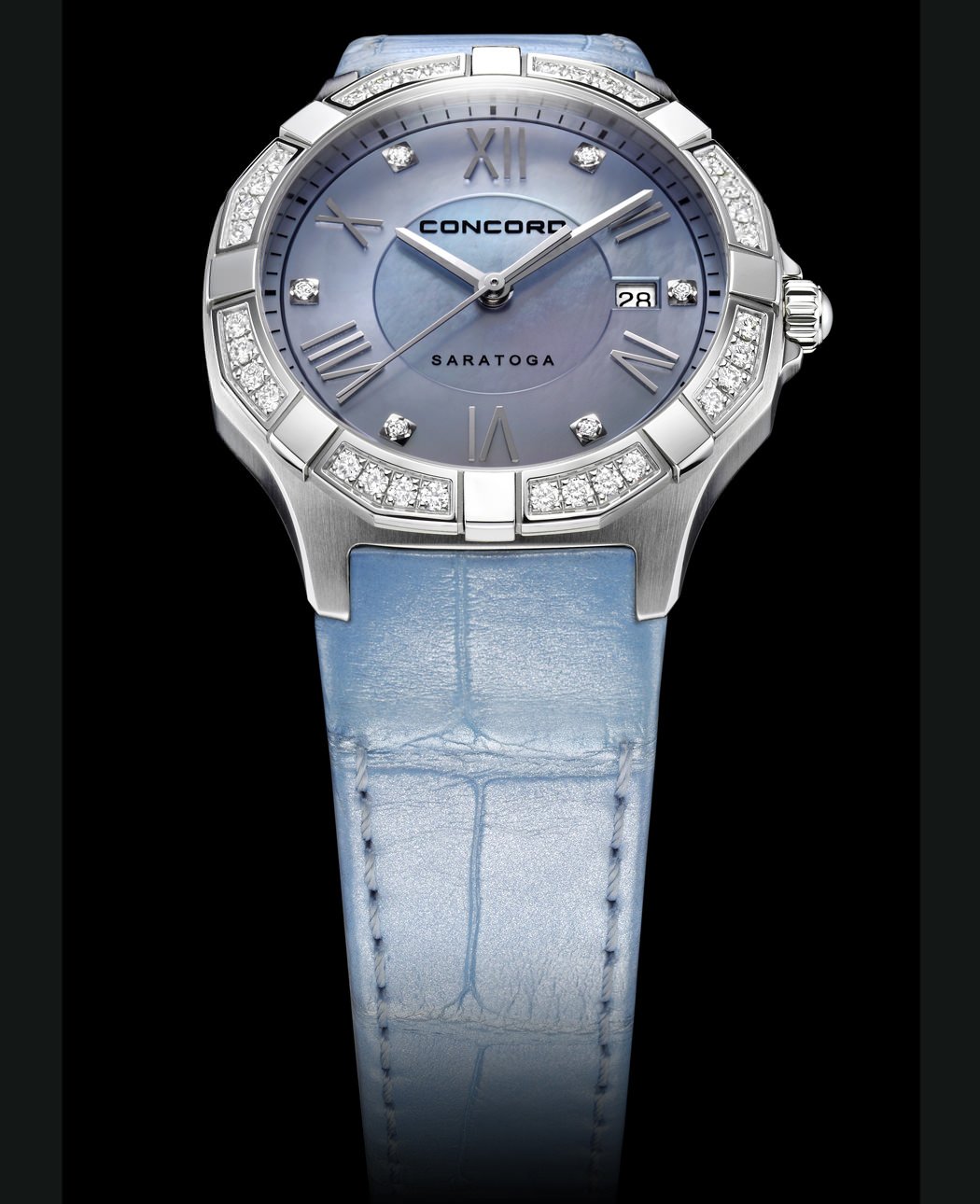 Strap: Pastel pearl blue alligator leather strap with stainless-steel pushbutton clasp