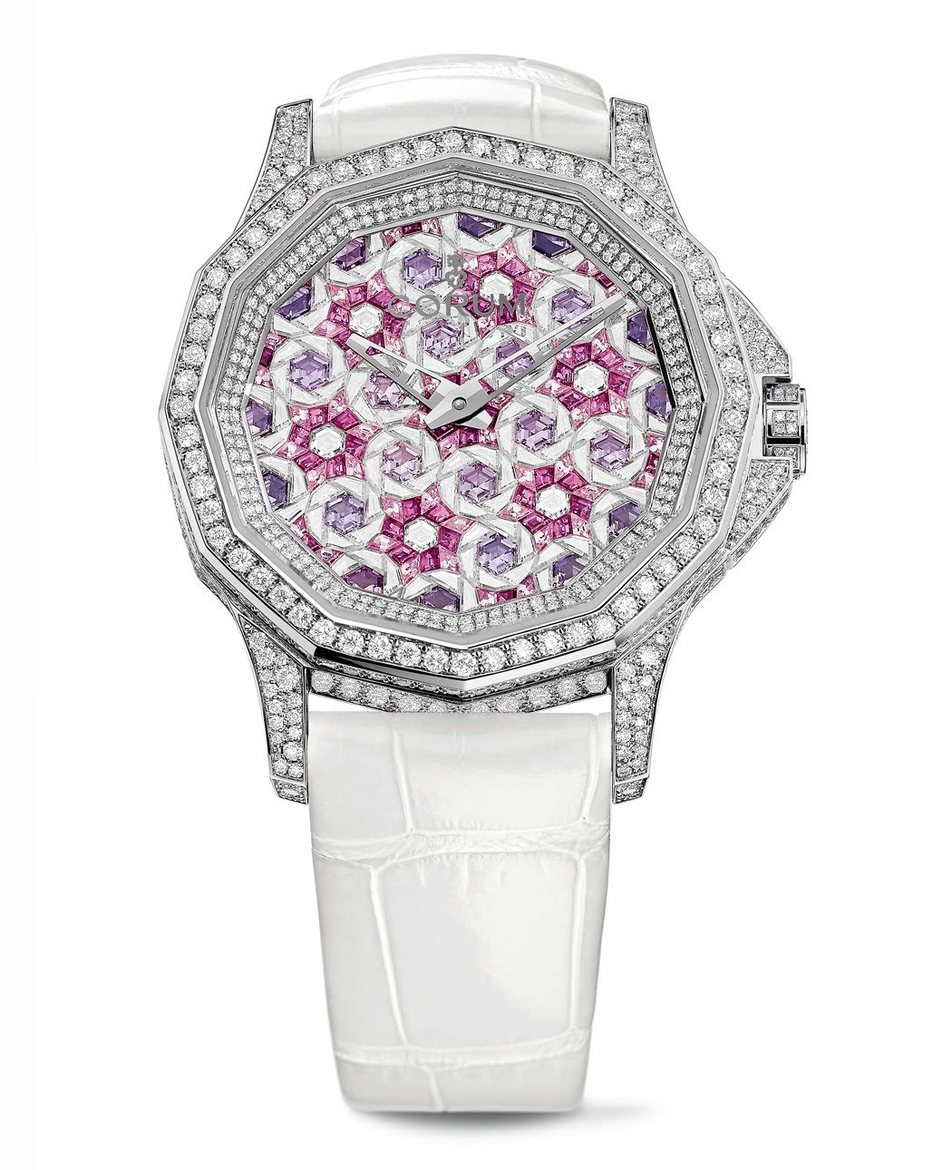 Movement: CO 082 calibre self-winding movement with 42-hour power reserve and 18-carat white-gold rotor set with 71 rose sapphires, 14 violet sapphires and 73 round diamonds