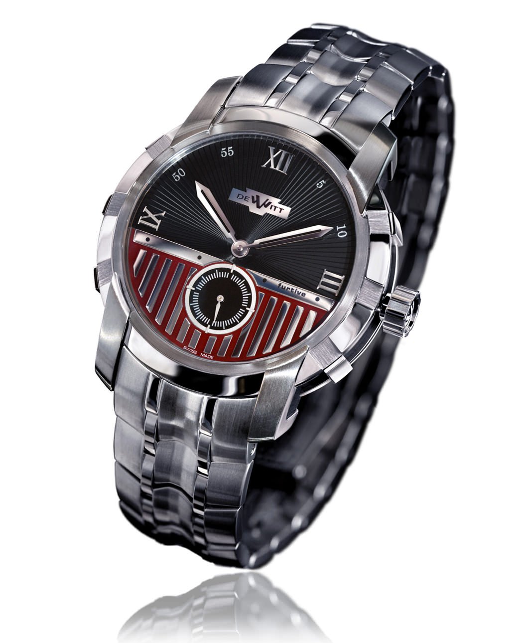 Case: 42mm diameter stainless-steel case with DeWitt imperial columns and black PVD treatment on the sides