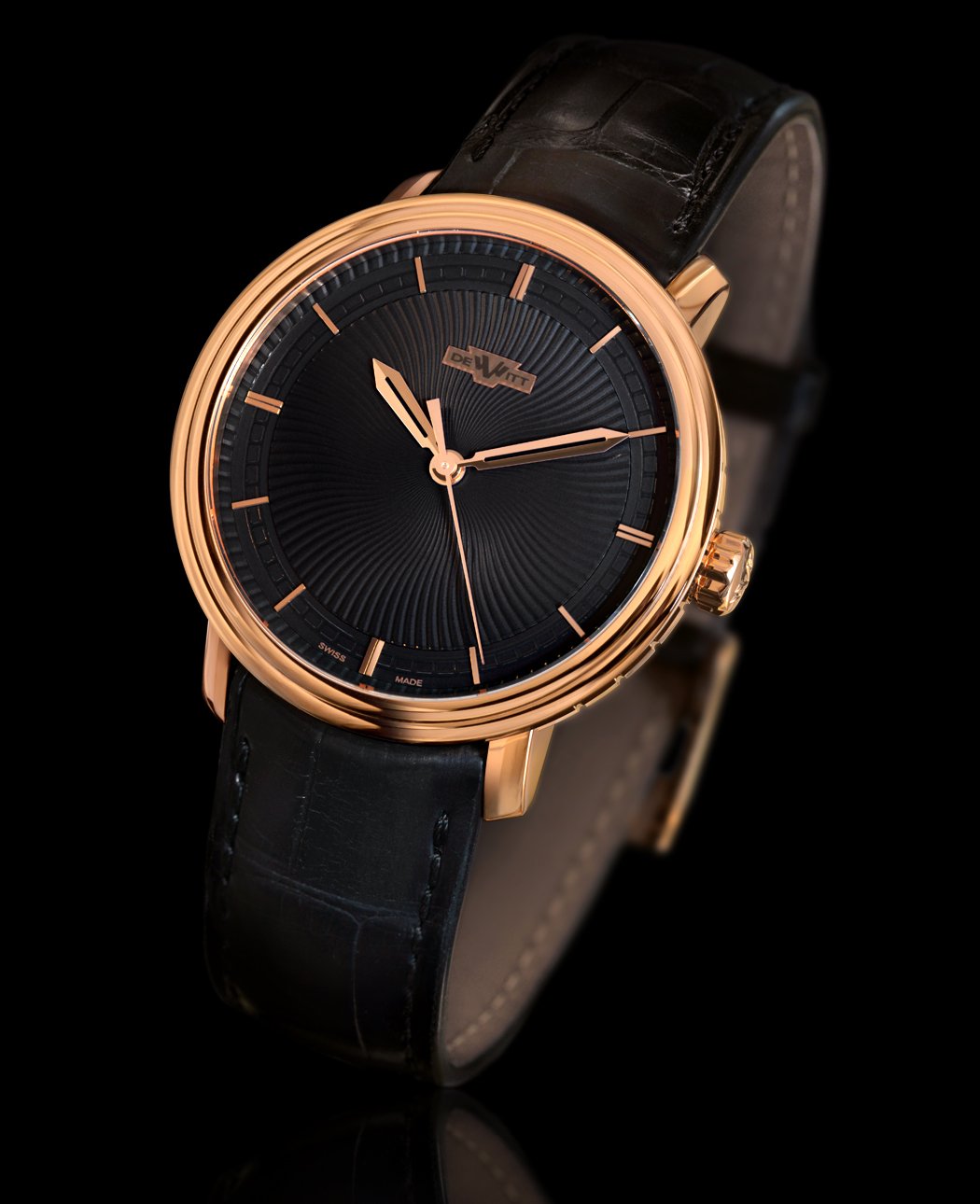 Dial: Black with sunray pattern and applied hour markers is rose-gold tone