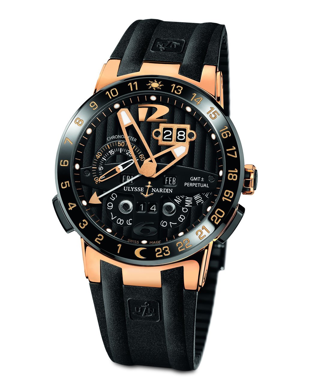 Functions: Perpetual Calendar adjustable over single crown. 2nd Time zone on main dial with a patented quick setting mechanism. Permanent home time indicated by 3rd hand. Big date in double window