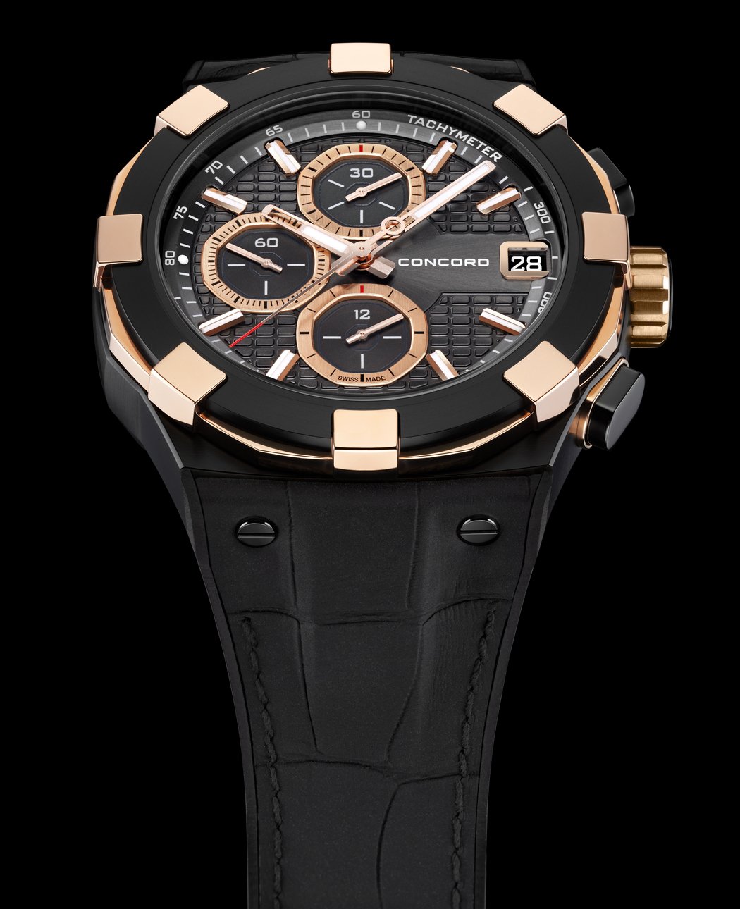 Strap: Black rubberised alligator leather sewn on to rubber, black PVD treated titanium folding clasp