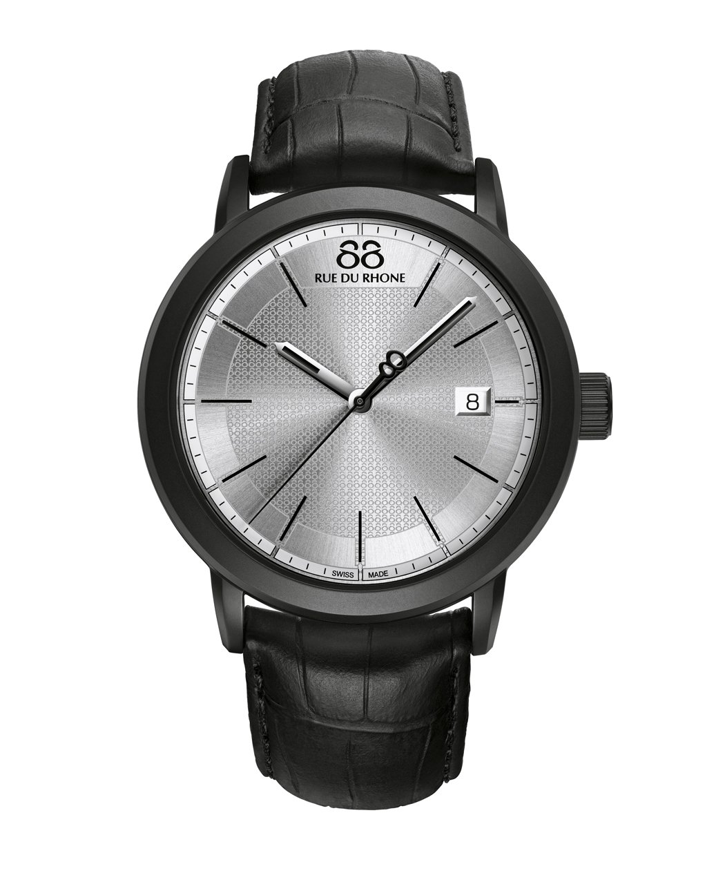 Case: 45mm stainless steel with matt black PVD coatingMovement: QuartzDial: SilveredStrap: Black leather