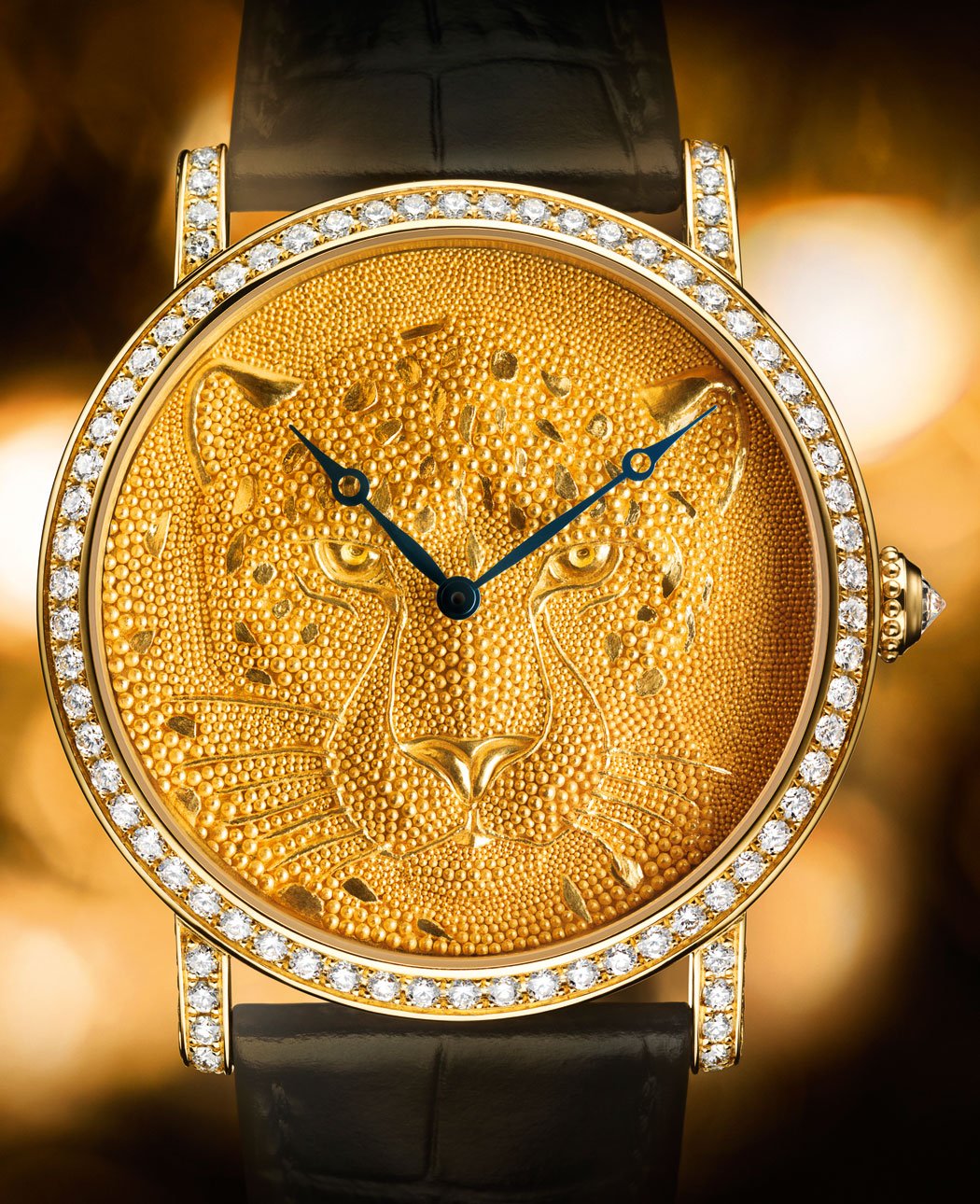 It was only in the 20th century that jewellers guessed that the Etruscans probably used a form of organic glue to achieve the effect, which securely binds the spheres to the surface without any solder and without any metal welling up around the edges of the spheres. Cartier has now revived this ancient technology for use in a wristwatch, taking the brand’s emblematic panther as its subject.