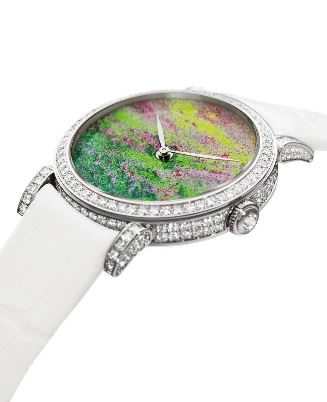 Delaneau’s goal was to interpret miniature enamel painting in a new way, paying homage to impressionism. In order to capture the famous light, movement and atmosphere of impressionism, enamel techniques had to be reinterpreted. It necessitated the use of many different enamel colours, each of which had to be individually fired, layer upon layer. White-gold case set with 196 diamonds, diamond-set crown, alligator strap with white-gold buckle set with 24 diamonds. Unique piece.