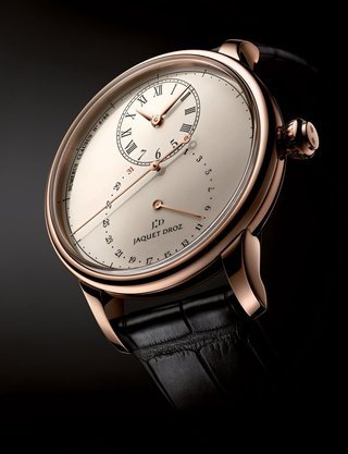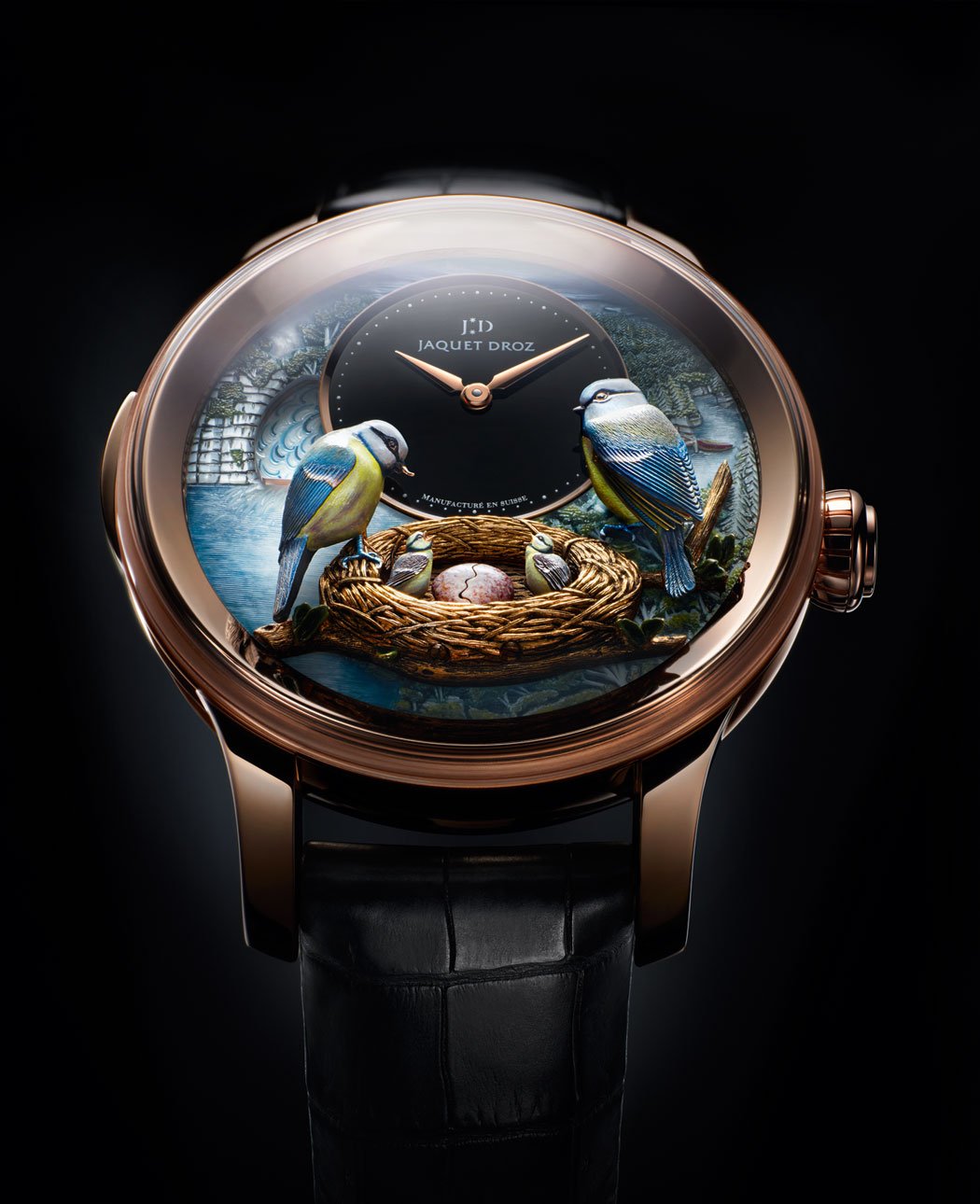 The Bird Repeater combines a minute repeater and an automaton of birds feeding three chicks, of which one comes out of an egg, while the water of the stream flows in a continuous cascade. The base dial is hand-engraved and painted mother-of-pearl. The waterfall is on a rotating disc that spins to create the illusion of falling water. The birds and nest are also hand-engraved and painted individually. The animation sequence has an impressive level of action with wings opening, eggs hatching and chicks being fed.
