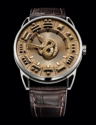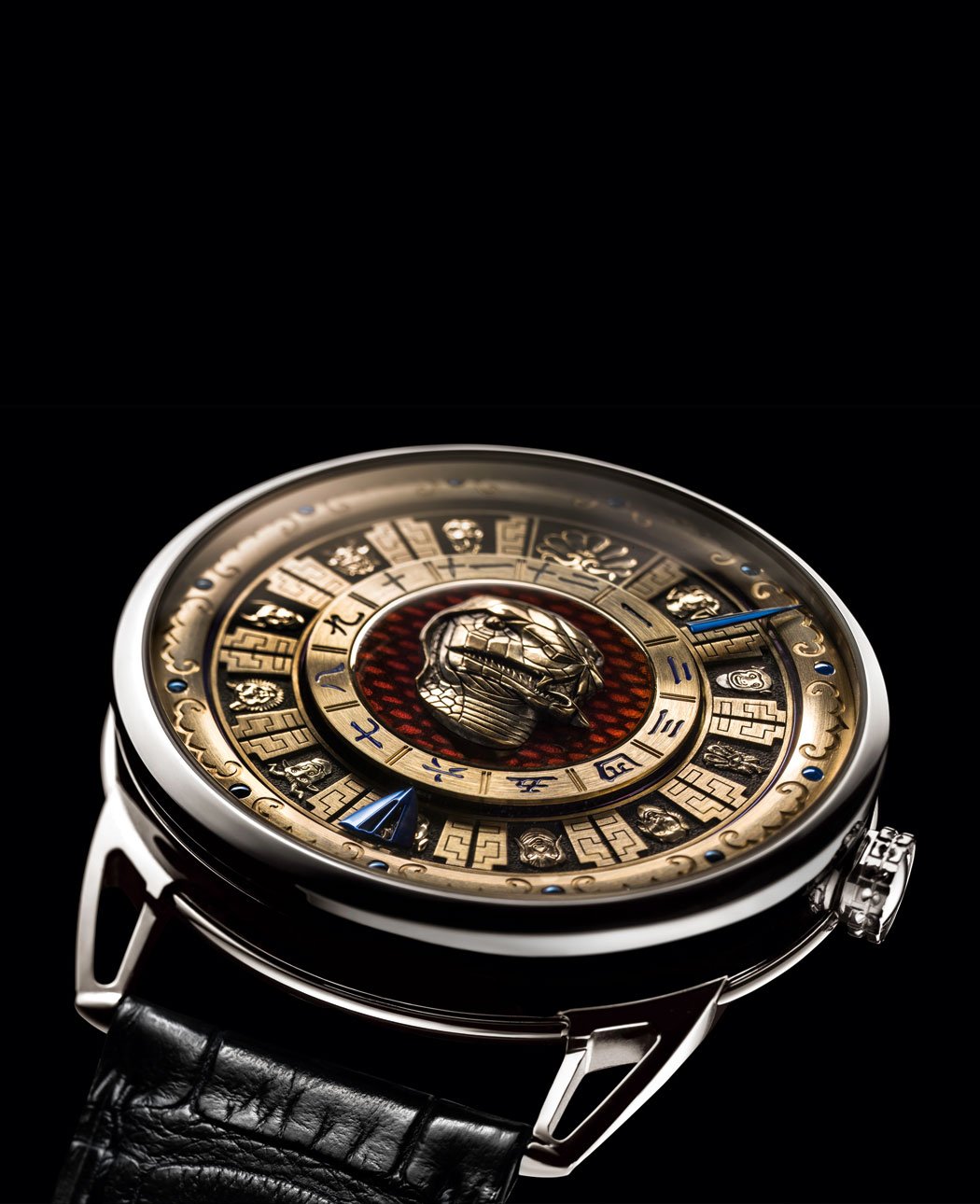 These watches feature elaborately engraved animal heads for the 12 Chinese zodiac symbols. Each of the animal heads engraved by master artist Michèle Rothen, using the bas relief technique, is in the middle of the dial of the watch, backed by a grand feu enamel relief of the corresponding Zodiac symbol.
