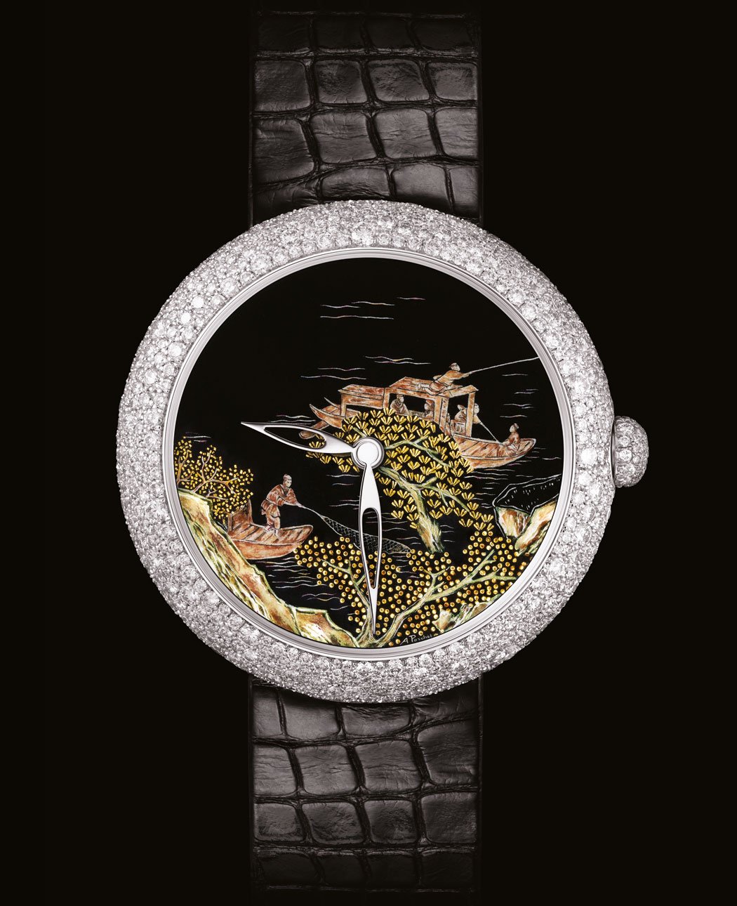These jewellery watches, inspired by the Coromandel lacquered panels cherished by Gabrielle Chanel, faithfully echo their splendid motifs. These motifs are reproduced in miniature enamel, by Anita Porchet, a highly renowned independent Swiss enamel artist. On a base that is a deep black enamel with shimmering blue reflections, the paint (composed of brushed enamel mixed with oil) is applied with a brush in meticulous individual touches, in order to depict the scene in all its smallest details.