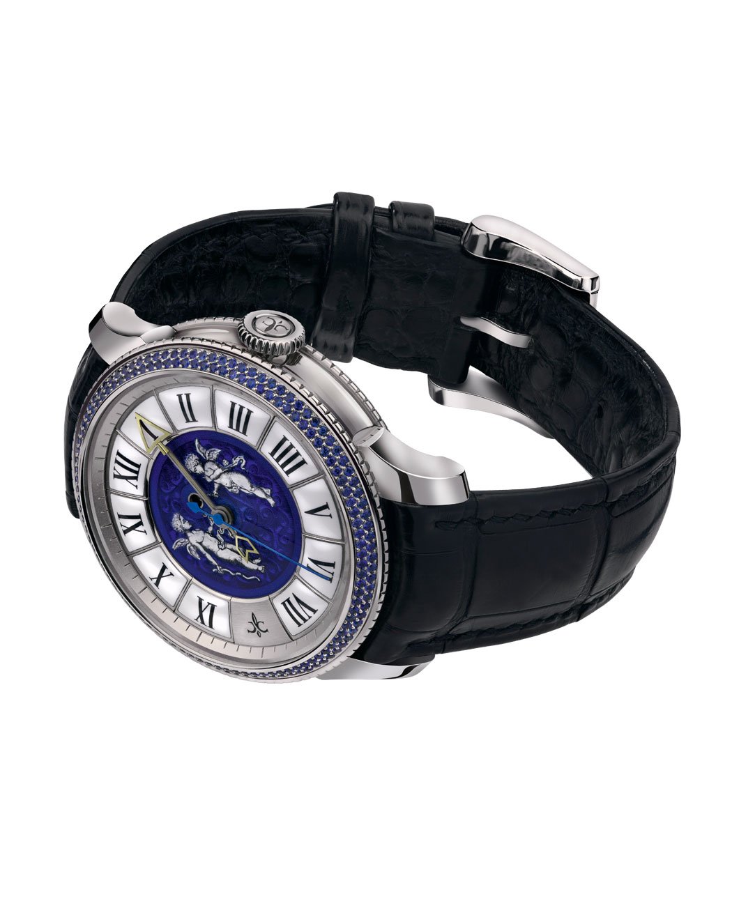 In the delicate “grisaille” technique, the enameller works into the enamel fine gold or silver patterns, using either a hand chisel or punch. The 13-part dial is made from enamelled solid 18-carat Pd125 white gold, with traditional grand feu black and white enamelled domed cartouches. The centre of the dial is made from enamelled solid 18-carat gold featuring grand feu enamel miniature, using the “grisaille” technique. The three-coloured hands (blue, grey and yellow) are hand-engraved and designed to represent an arrow once together. The colours are obtained without either chemical treatment or lacquer.