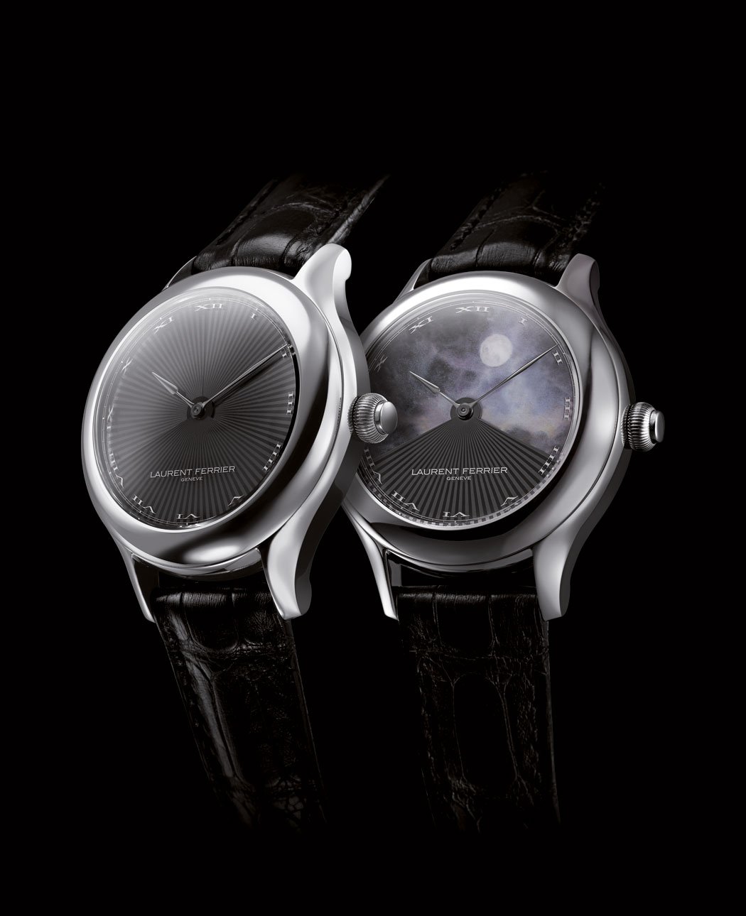 The smooth rounded 18-carat white-gold case of the Galet model (“galet” means “pebble” in French) plays host to two features unique to Laurent Ferrier. The first is the “secret” mechanism, which can be activated on demand by the pushbutton in the crown and can be programmed to open over a specific 60-minute period chosen by the owner. This opens up a 240-degree aperture on the dial to reveal a custom-made decoration on the dial produced to the customer’s requirements by renowned enamel artist Anita Porchet. The second feature is found in the movement, which uses two inversed hairsprings in the manually-wound tourbillon mechanism to cancel out the effects of the Earth’s gravity.