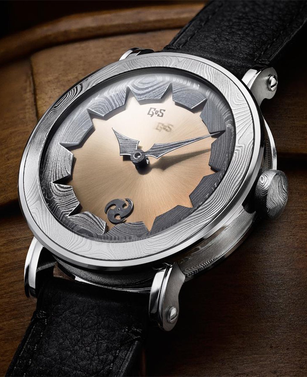 Dial: Solid 18-carat gold dial with sunray finish, damascus steel chapter ring, hands and crown