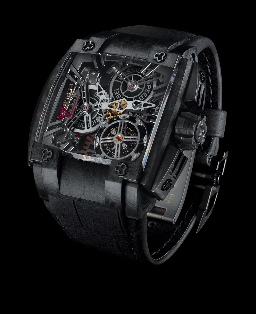 Movement: Proprietary REB T-14 tourbillon movement with 490 components using components such as aluminium, ceramicised magnesium (tourbillon cage), titanium and carbon fibre, twin mainspring barrels for 14-day power reserve