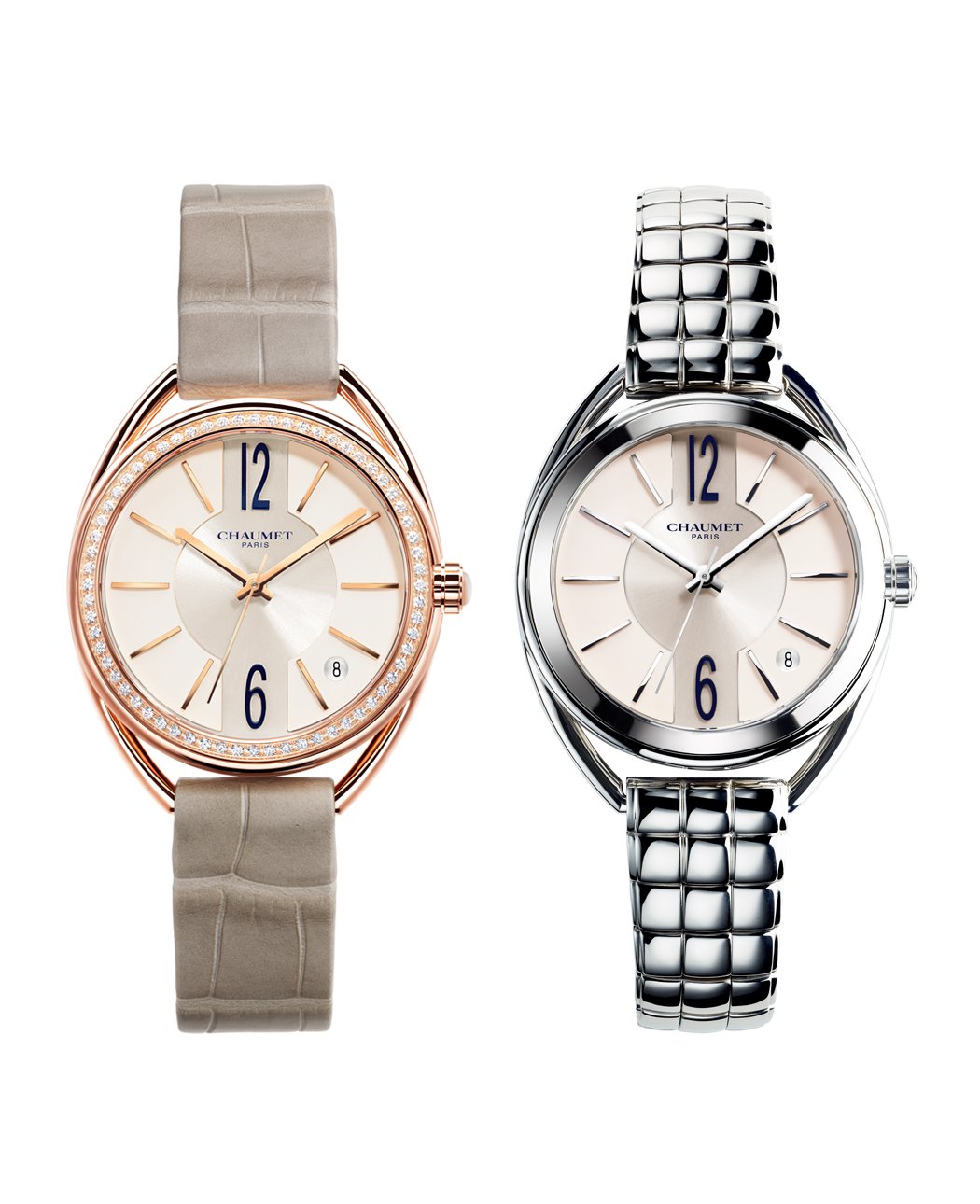 Conceived as a tribute to streamlined purity and elegance, the new Liens watch by Chaumet is available in six versions, in rose-gold or steel, with or without diamonds, on a leather strap or a metal bracelet. The “lien” motif seems to be in continuous movement as it draws its cross-over signature on the profile of the case and creates a link on each side of the dial. The dial, in white lacquer and satin-finished silver, presents a perspective with the numerals and indexes. The crown is set with a mother-of-pearl cabochon. Liens is powered by a self-winding automatic movement (hour, minute, second and date indicator at 5 o’clock).