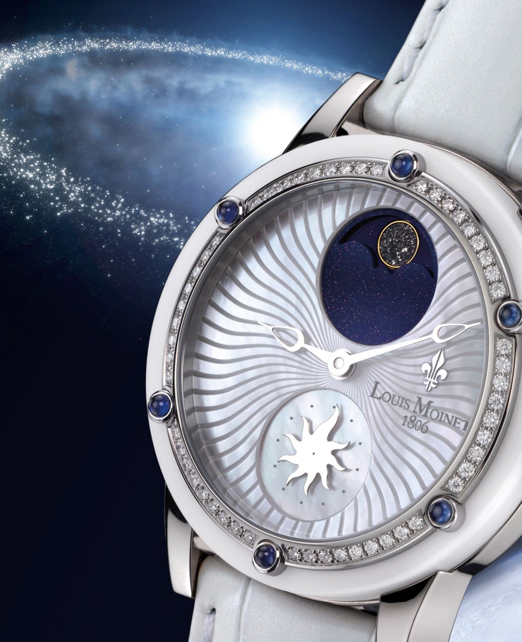 On the mother-of-pearl dial featuring Louis Moinet’s signature Côtes du Jura guilloché, night is evoked by the moon phase indicator and day by the silvered sun-shaped small seconds. The white ceramic bezel is distinguished by an inner ring of 54 VVS Top Wesselton diamonds and 6 cabochon-cut sapphires. The case is made of high-tech, grade 5 polished titanium. The self-winding movement is visible through the case back with a rotor decorated with a new moon surrounded by the golden rays of a sun.