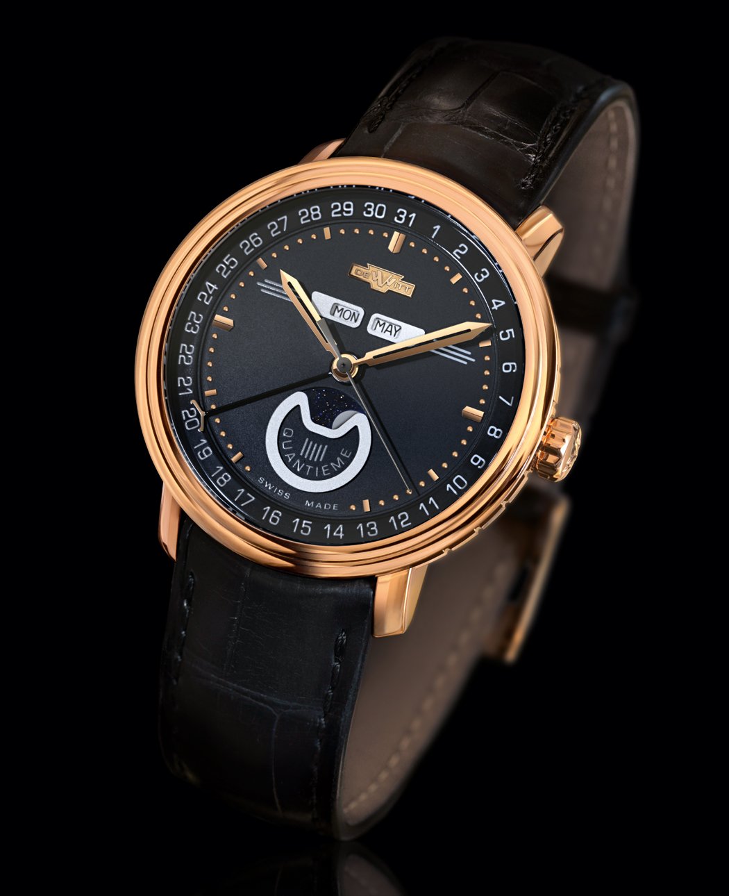 The watch is equipped with a self-winding mechanical movement that offers a power reserve of approximately 42 hours. In addition to indicating the hours, minutes, and seconds, the movement has a calendar with days of the week in the aperture at 11 o’clock, months at 1 o’clock and the date using a central hand. The mother-of-pearl moon phase indicator positioned at 6 o’clock is placed on a “goldstone” sky.