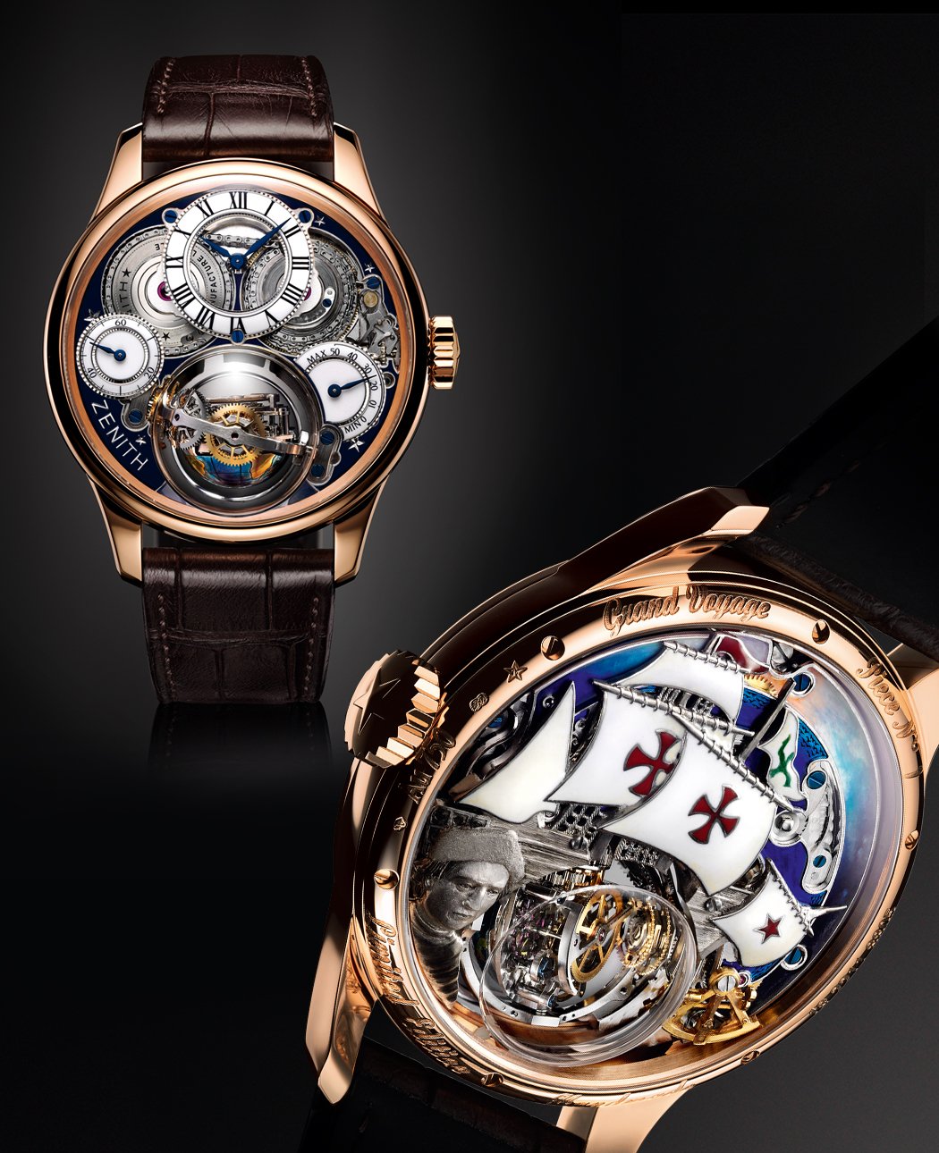 The three gold subdials (hours/minutes at 12 o’clock, small seconds at 9 o’clock, power reserve at 4 o’clock) are finely guilloché, enamelled in white and fitted with blued steel hands and screws. The plate has been entirely hollowed out by hand so as to leave only the Zenith logo and a flurry of stars standing out in relief; and the troughs thus created have been filled with midnight blue lacquer. The counterweight of the gravity control system has also been enhanced with a hand-crafted micro-painted depiction of the Southern hemisphere.