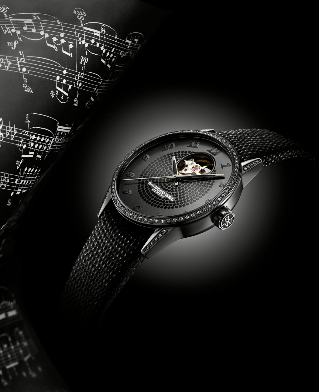 For the first time, Raymond Weil is offering a feminine timepiece in black PVD. Like the rest of the watch, the dial, the Arabic numerals, the hands, the 86 diamonds set on the bezel and the lugs, and the sharkskin-style leather strap are black. The automatic winding mechanical movement, visible through an opening at 12 o’clock, is the only non-black exception.