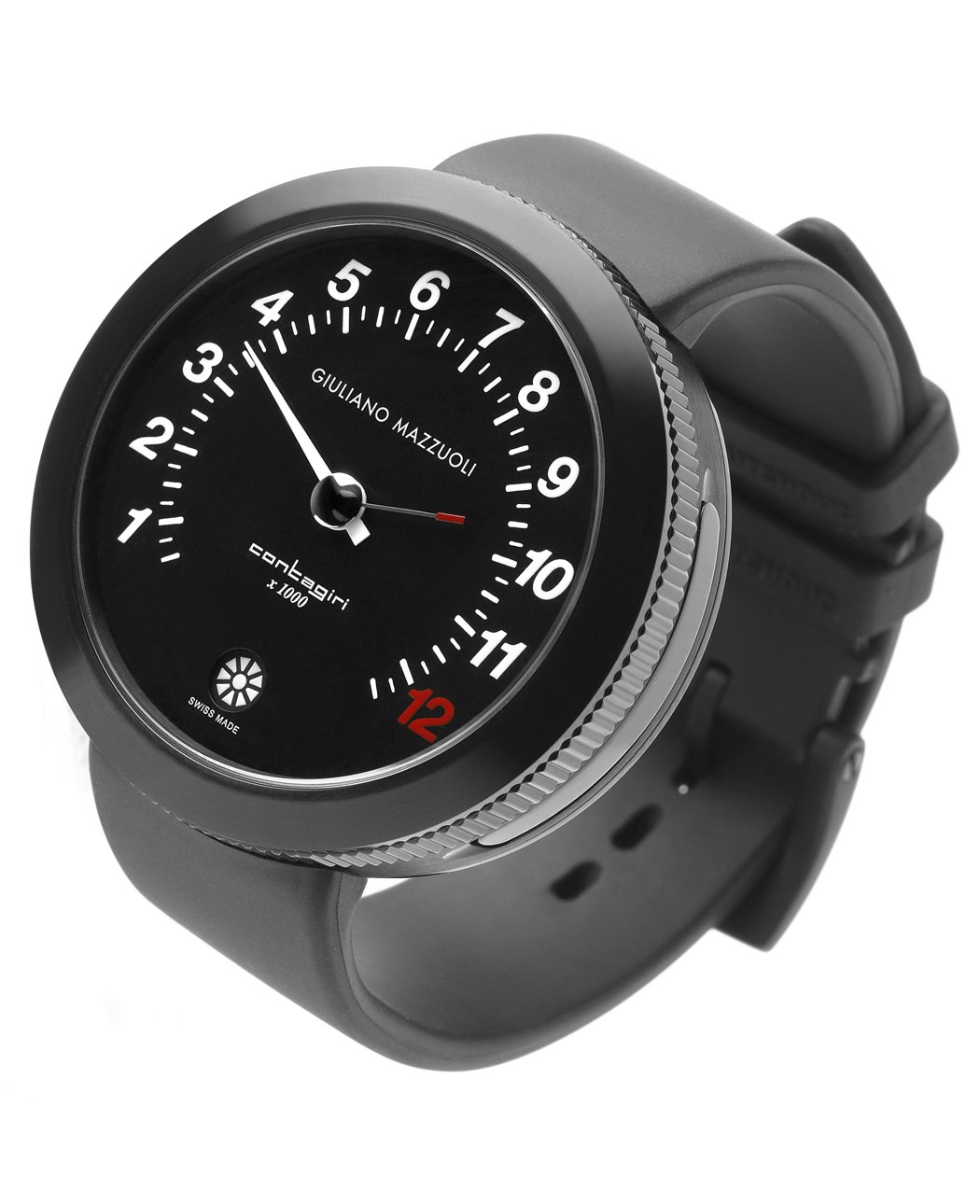 Dial: Black dial with arabic numerals for the Giuliano Mazzuoli model with a DLC all-black case in matte steel. The version dedicated to the Contagiri 8C Competizione has the same dial design as the tachometer in the car and now has a DLC all-black case in matte steel.