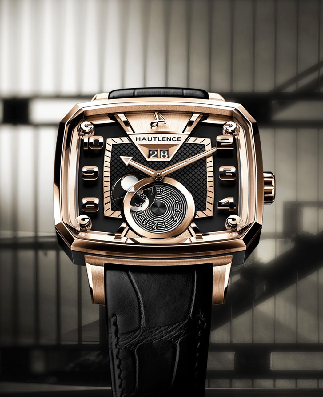 Dial: opaline black base adorned with “Clous de Paris” hobnail motif, sapphire intermediate dial with applied hours, indexes and logo, HAUTLENCE engraved on the large date bridge;