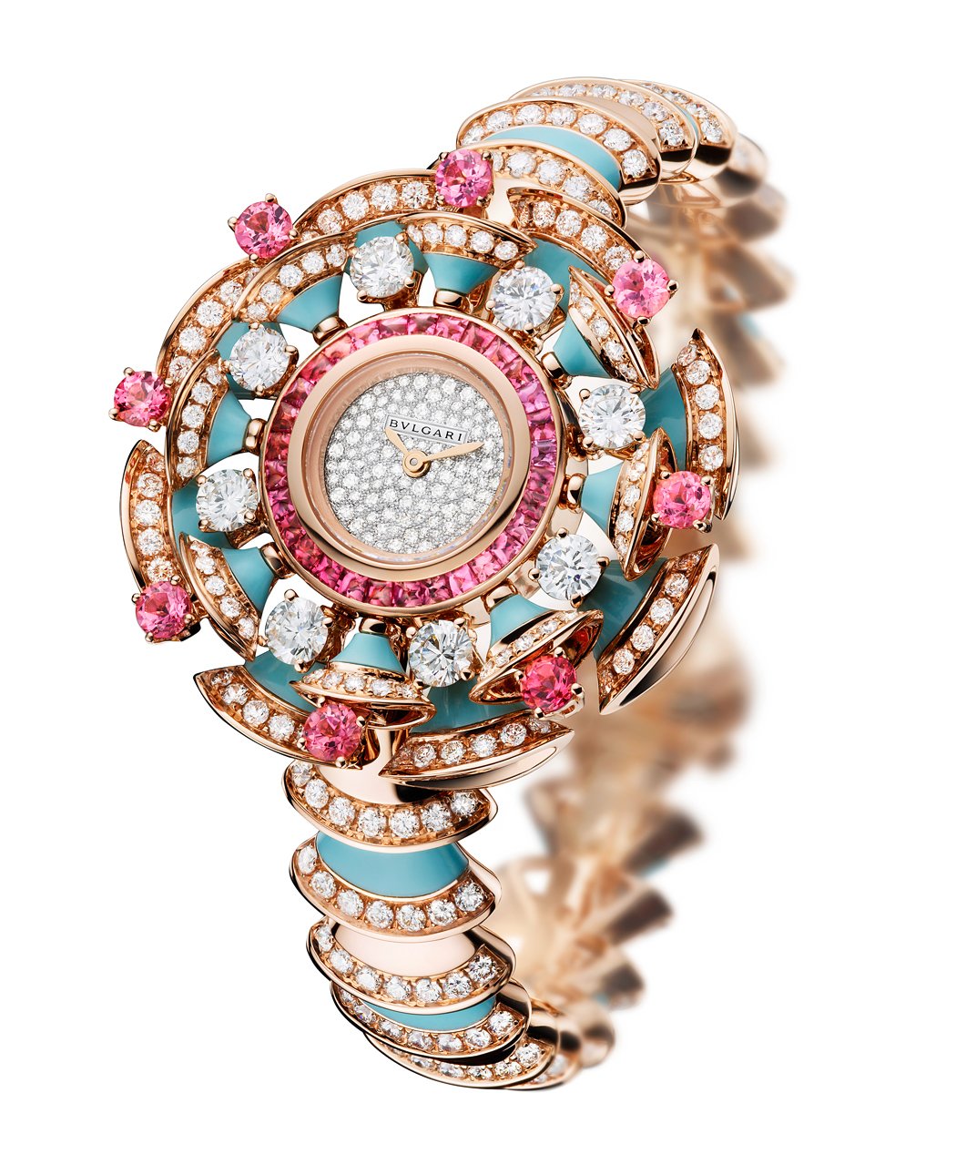 High Jewellery watch with 18 ct pink gold case and bracelet (approx. 107.35 gr) and white mother-of-pearl dial; set with 286 brilliant-cut diamonds totalling approx. 5.67 carats, as well as 8 rubellites and 8 amethysts.