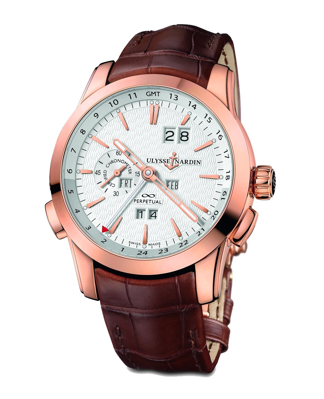 Second time zone on main dial with a patented quick setting mechanism.