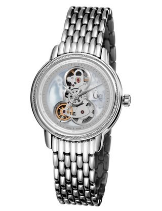 For the dial, white mother-of-pearl lends a touch of iridescent softness while the rose gold PVD treatment of hour-markers and case brings a precious appearance to the whole.