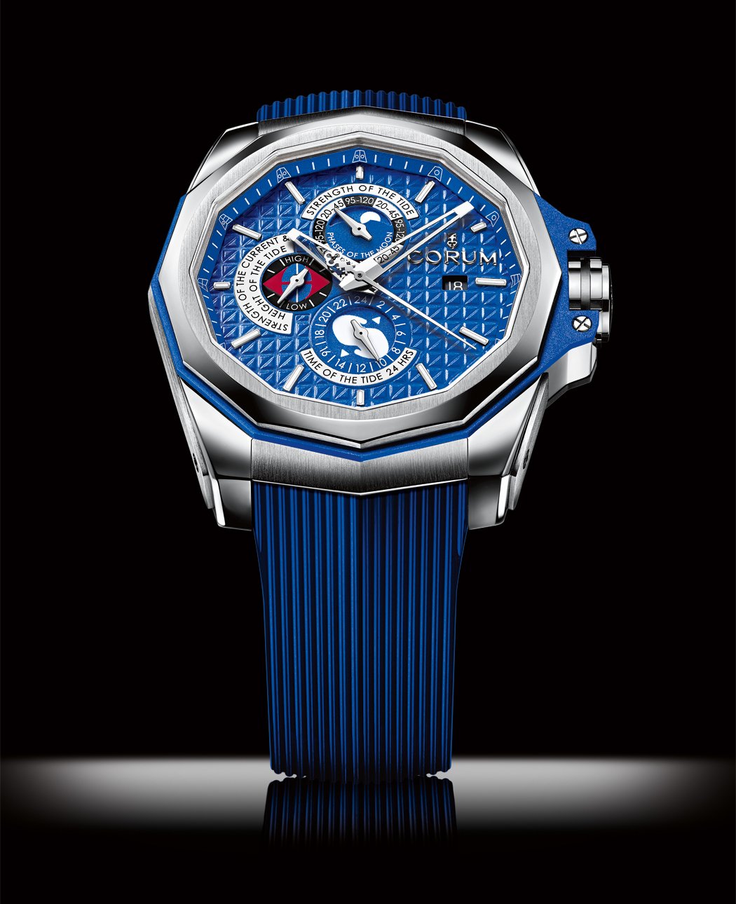 Distinctive features: Hourly nautical pennants transferred on the flange • Applied rhodiumcoated minute indexes with white superluminova • Corum logo applied on the dial • “Grenadier fendu” finishing
