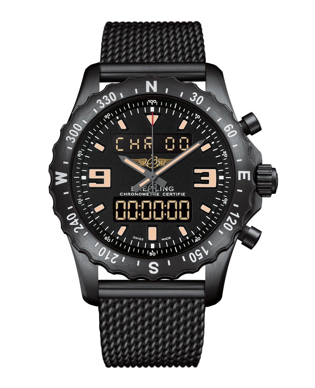 Movement: Breitling Caliber 78, officially chronometer-certified by the COSC, SuperQuartzTM (thermocompensated quartz), analog and LCD 12/24-hour display (NVG compatible). 1/100th of a second chronograph with split times, alarm, countdown, dual timezone display with independent alarm, Coordinated Universal Time (UTC), calendar day and date programmed for 4 years, battery end-of-life indicator.